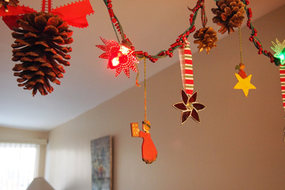 日曜日の夜に買いに行き、スタンドに立てて丸1日そのまま置き(そうすると、枝が自然に垂れてくるので形が落ち着く)、月曜日の夜に飾り付けを済ませた。