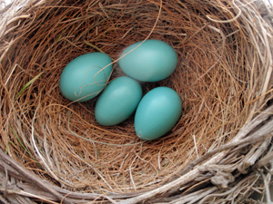 と思いつつ、邪魔をしては可哀想だから、見て見ぬふりをしていたが、親鳥がちょっと留守にした間にだんなが見たら、卵が4つあった。
