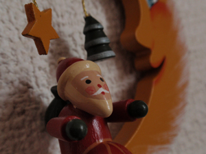 リースと、先日だんなが六本木ヒルズのドイツフェア(とか何とか)で買ってきた、ドイツのオーナメントを飾って、雰囲気だけ出してみた。