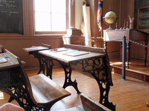 二人掛けの机が並んでいて、前方には黒板。
