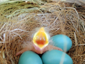 夕方、出かけて戻った時、だんながロビンの巣を見ると、親鳥の姿がない。