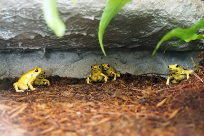 カエル嫌いな私だけど、この珍しい、小さなカエルたちはなんだか妙だったので思わずシャッターを押した。 Golden Poison Frog。穴蔵で会議中。