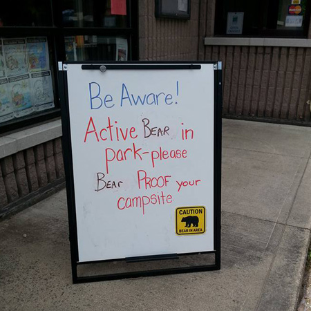 注意!熊がパーク内にいるので、キャンプサイトでは熊よけ対策を!というようなことね。