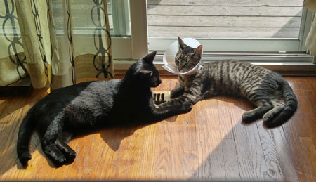 HanaがMickの患部を舐めたり、ばたばたと遊んだりしないように。