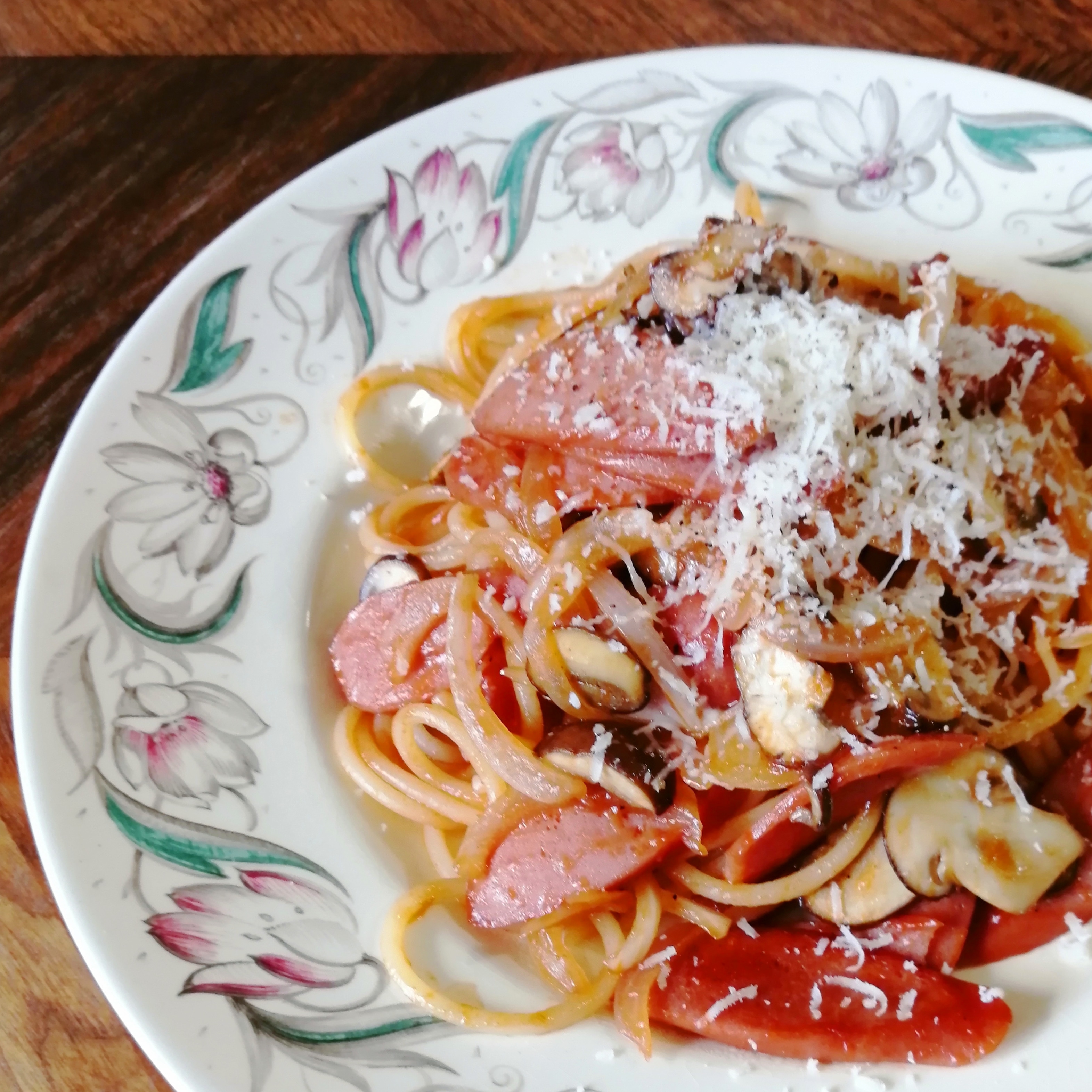 パスタを茹でている間に炒めて、茹で上がったパスタを入れて一緒に炒め、ケチャップをどばっと入れる。