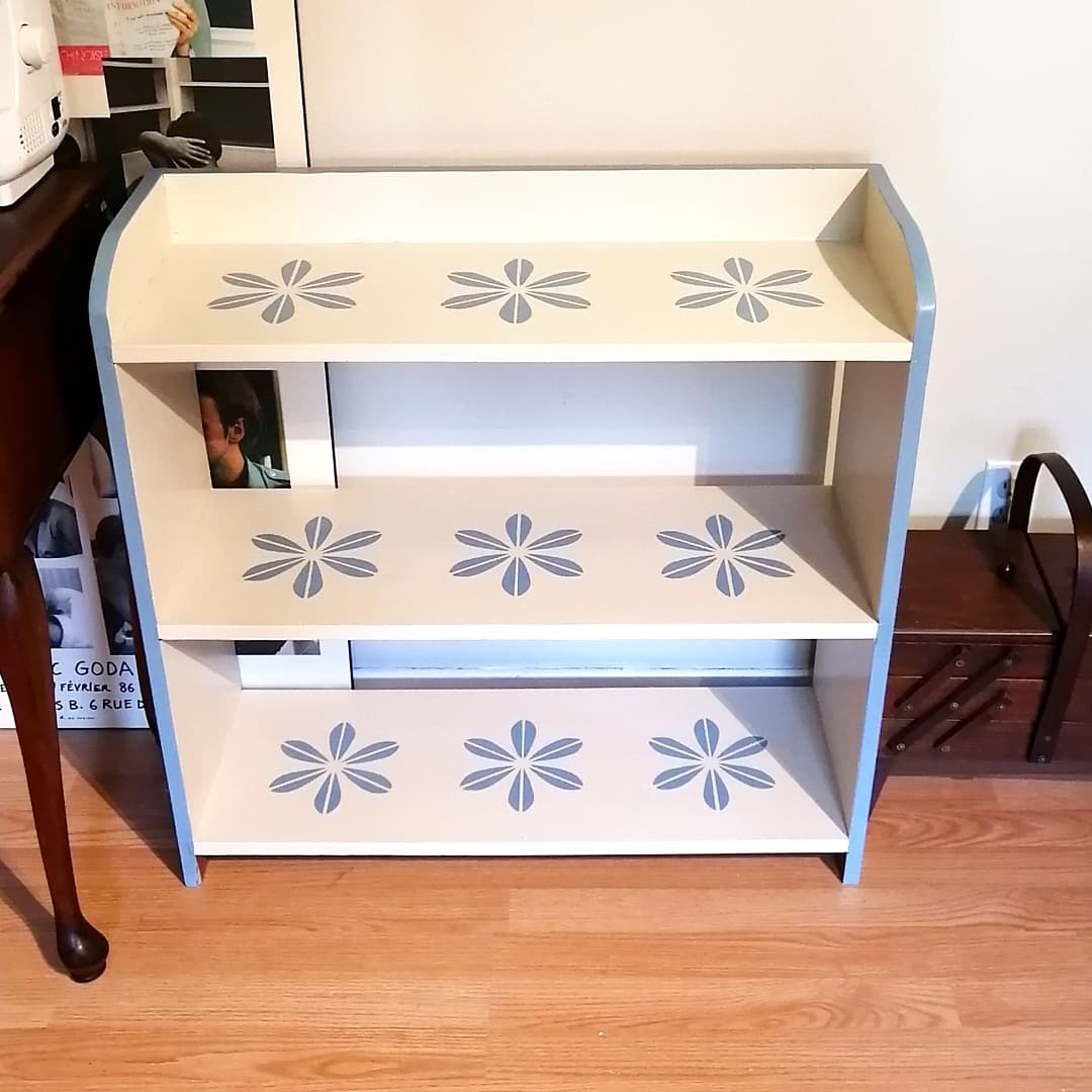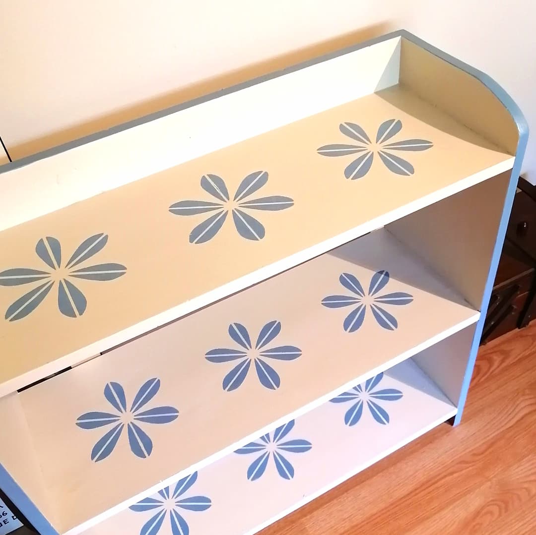 と浮かんだデザインは、2色使いで、棚の部分にステンシルでパターンを描くという、ちょっと手が込んだもの。