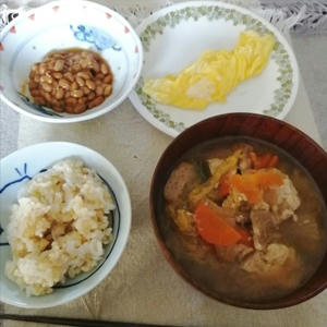 玄米と野菜たっぷり肉少な目の豚汁、手作り納豆、プレーンオムレツ