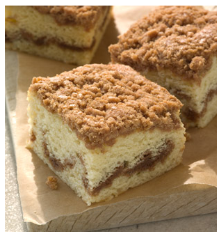 柔らかなパウンドケーキみたいな感じの四角いケーキに、シナモンの味のクランブルがかかっている。