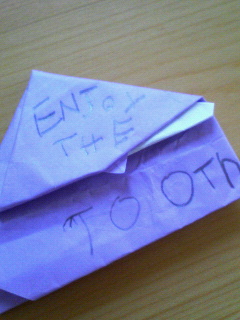 とってもとっても小さな歯だから、枕の下に置いてもわからなくなっちゃうだろうと思って、折り紙に包んで(昔、医者で貰った粉薬が包んであった様に)あげた。