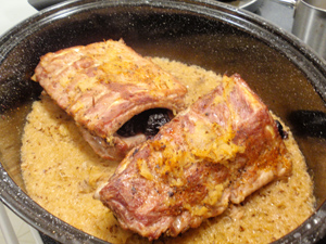 大きなローストポットにサワークラウトを敷き、リブを乗せ、オーブンで焼く。