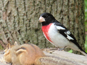 今度は、いつも誰かが餌を置く場所で待っていると、チップマンクがたくさん集まり、鳥達もやってきた。