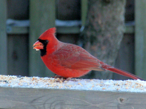 今朝は真っ赤なカーディナルが、朝食を食べにやって来た。