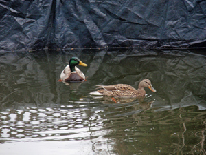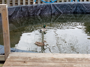 だんながキッチンに立っていて、ふと庭を見ると、なんとつがいのカモがプールをすいすい泳いでいた!