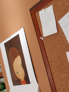 それを取り除き、フレームの後ろ側にぴったりはまる薄いボードを用意し、ボードにコルクシートを張り付け、それをはめ込む。