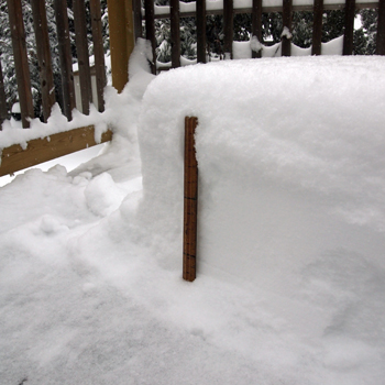 デッキに積もった雪を半分、降り止むまで残しておいて、その高さを測ってみた。