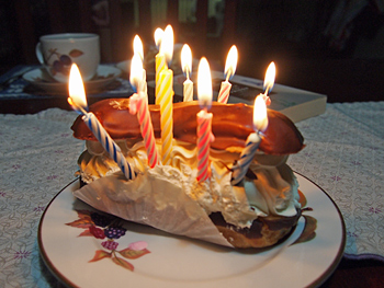 無惨にもろうそくを刺されたエクレアさん でも美味しかったぞー♪