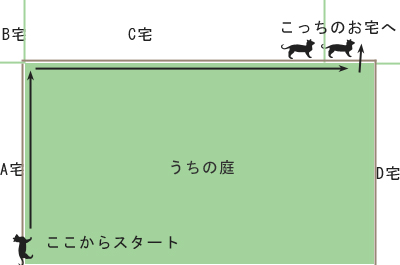 左側のフェンスの上にいた猫たちは、追いかけ(逃げ)ながら左角で右に折れ、たたたたーっと走り抜けて右側の裏の家の庭に降りて行った。